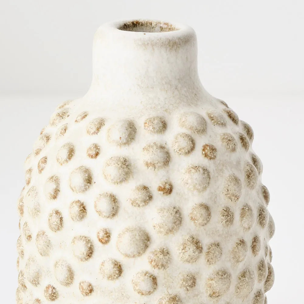 A sculptural ceramic vase with a tactile, pebble-like surface and soft ivory glaze. Its organic texture and rounded form makes it a beautiful standalone accent or a stylish vessel for a single stem.