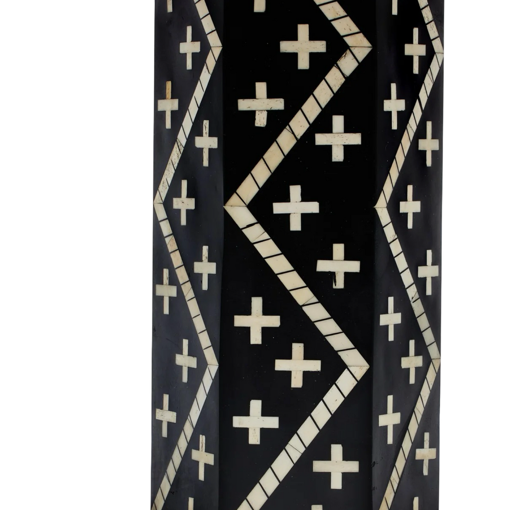 The Jali Table Lamp blends modern design with timeless craftsmanship. Handcrafted with natural bone and black resin inlay on a hexagonal base and finished with a black linen shade, each piece is uniquely one-of-a-kind.
